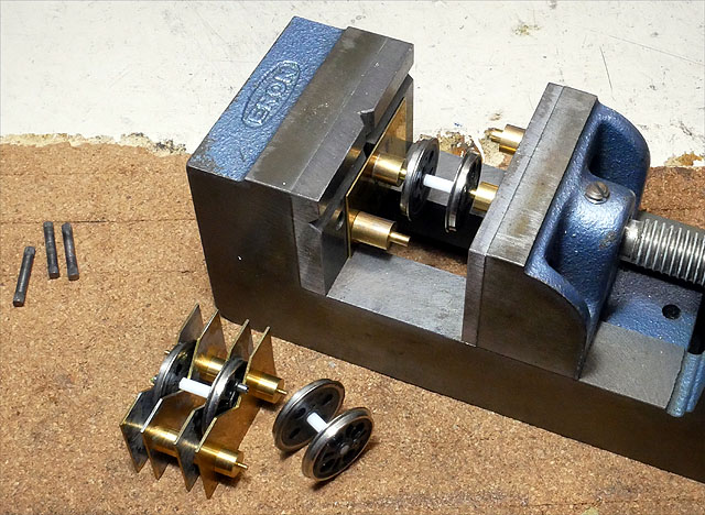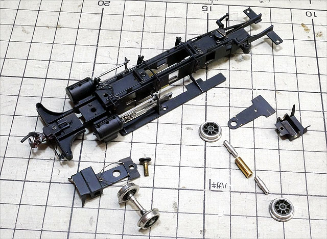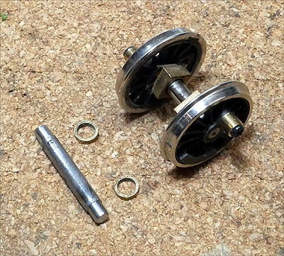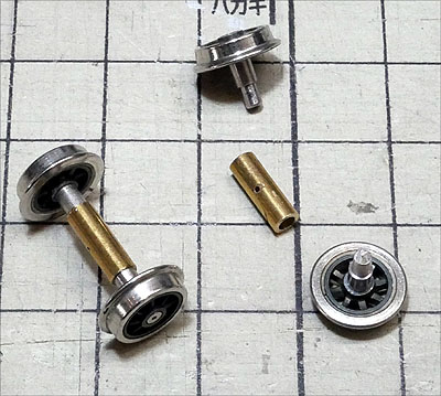 続いて、先輪と従輪の改軌、こちらは、軸を中央で切断して、パイプで軸を長くします。この際、先・従台車の軸箱の中で横方向にガタつかない寸法にしています。