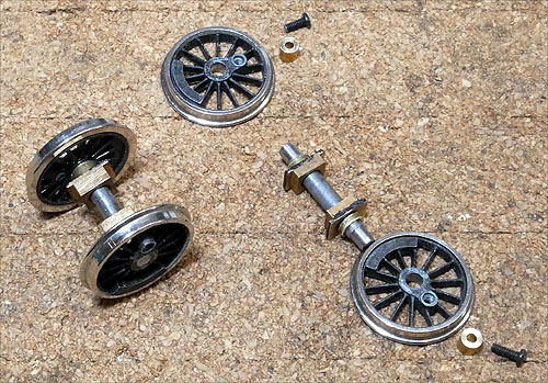 当時の動輪は輪芯がプラスチック製で輪芯にひびが入ってきたので、後日ダイキャストのものと交換して、3軸余っていました。
