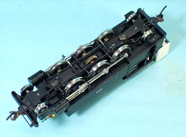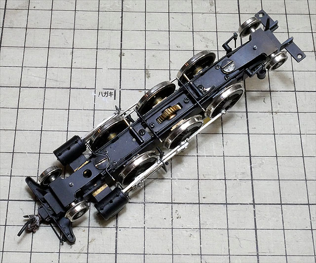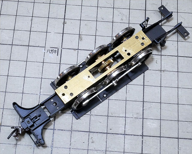 3軸とも改軌を終えて、回転を確認、OK。動輪押さえ板は仮に作ったもの。本来のはブレーキシューが当たって使えないので。