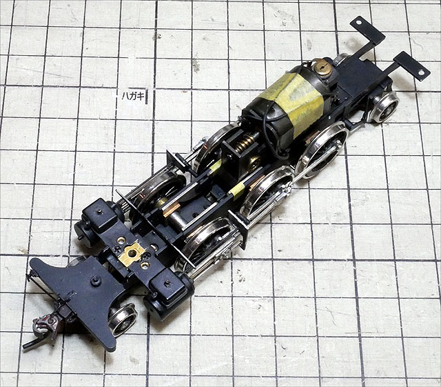 シリンダーブロックは左右一体です。第一と第二動輪間にあるイコライザーに貼っている黄色のテープは主台枠をいじっているときにイコライザーが抜けないようにするためのもの。