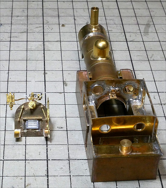 ボイラーに煙室部をハンダ付け。煙突部分にはダミーのネジをはめて位置を合わせています。