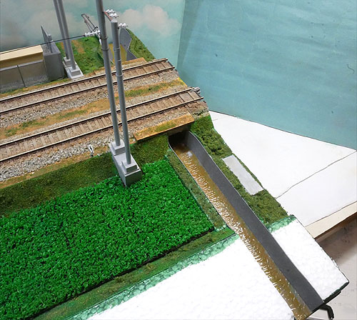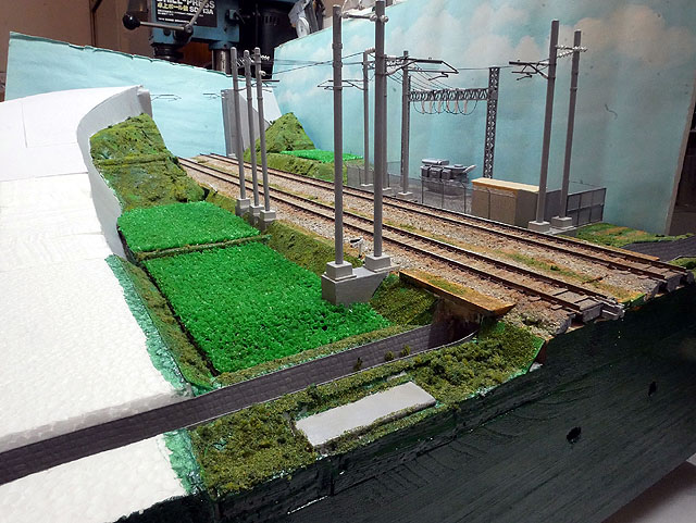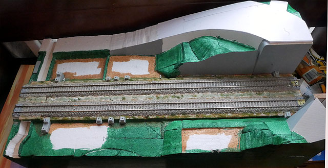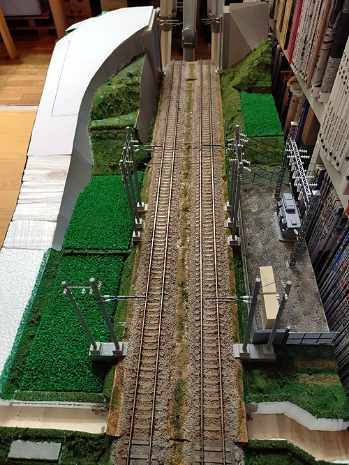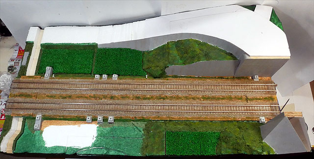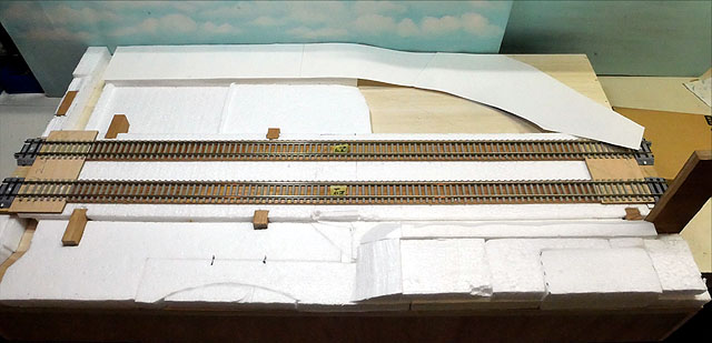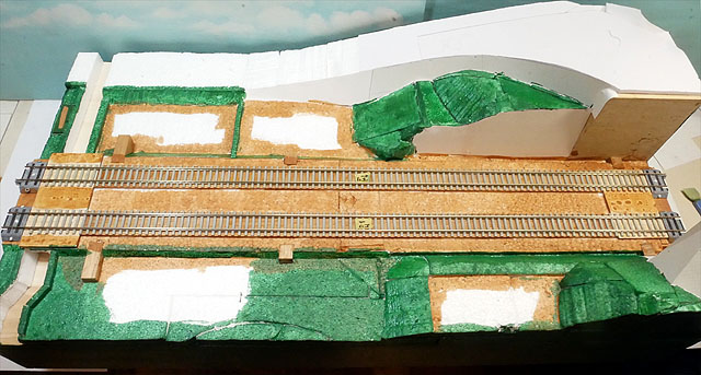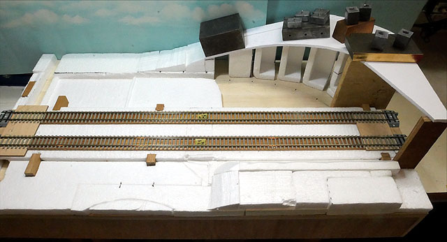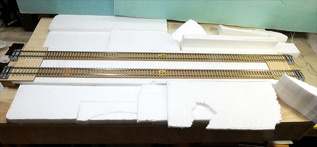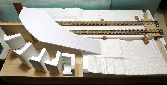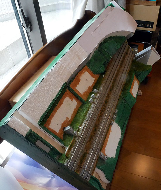 国道との立体交差を作成中。勾配部分は発泡スチロールで構成。