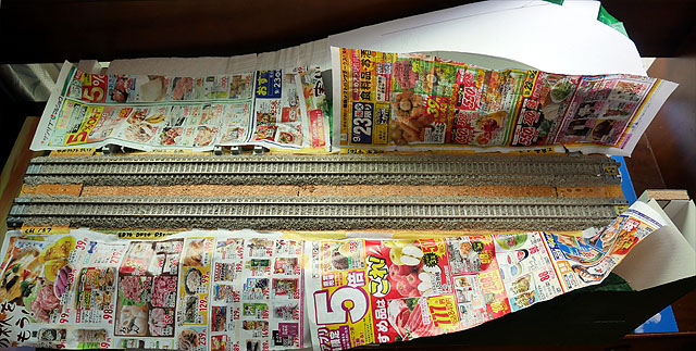 線路の下には厚さ2.5mmのベニヤ板、その下は発泡スチロールです。