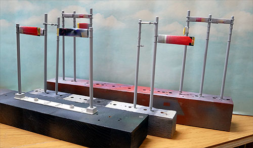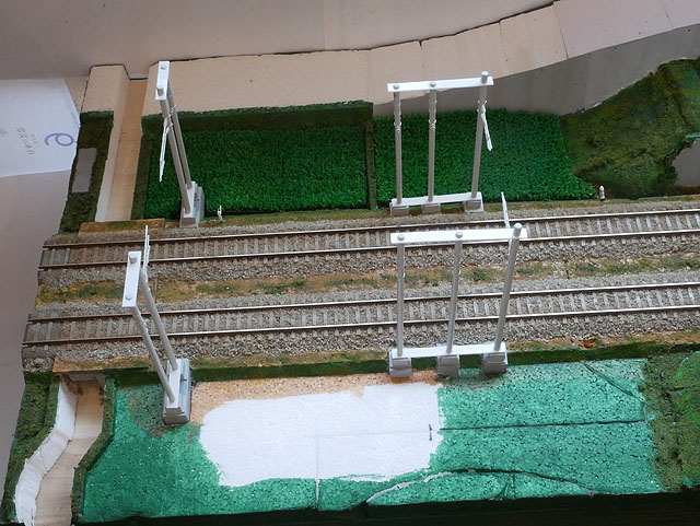 変電所近傍の架線柱を仮に立てています。間隔を維持するためプラ板で治具を作っています。