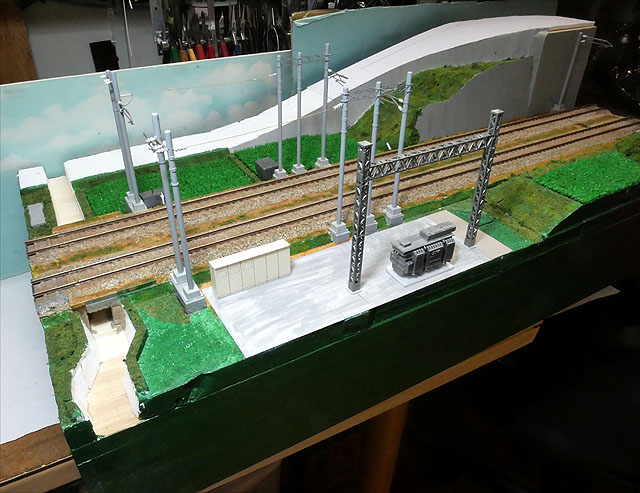 変電所から架線へのごちゃごちゃした配線が見所です。坂の途中のトレーラーは磁石で固定しています。