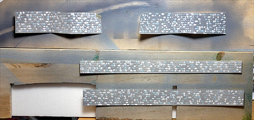 線路の周りを養生して、線路にバラスを撒き、薄めた木工ボンドで接着。