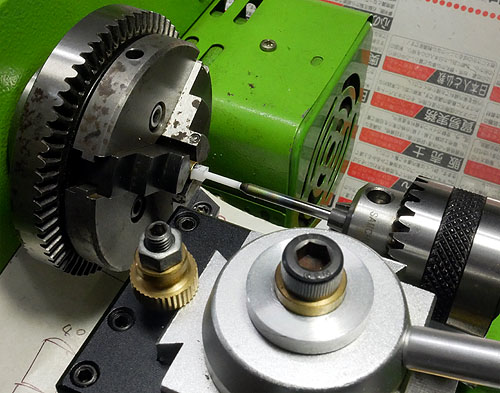旋盤で削るときは、角棒がぴったり入る真鍮パイプに差し込んで、三つ爪チャックにくわえています。