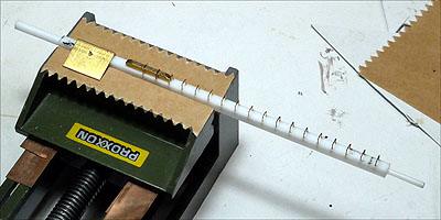 足掛けは、治具を基にΦ0.3mmの穴を開け、Φ0.25mmの真鍮線を曲げたものを挿しています。