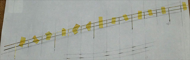 架線を作成。トロリー線はΦ0.6mmのリン青銅線、吊り架線やハンガーはΦ0.45mmの真鍮線。